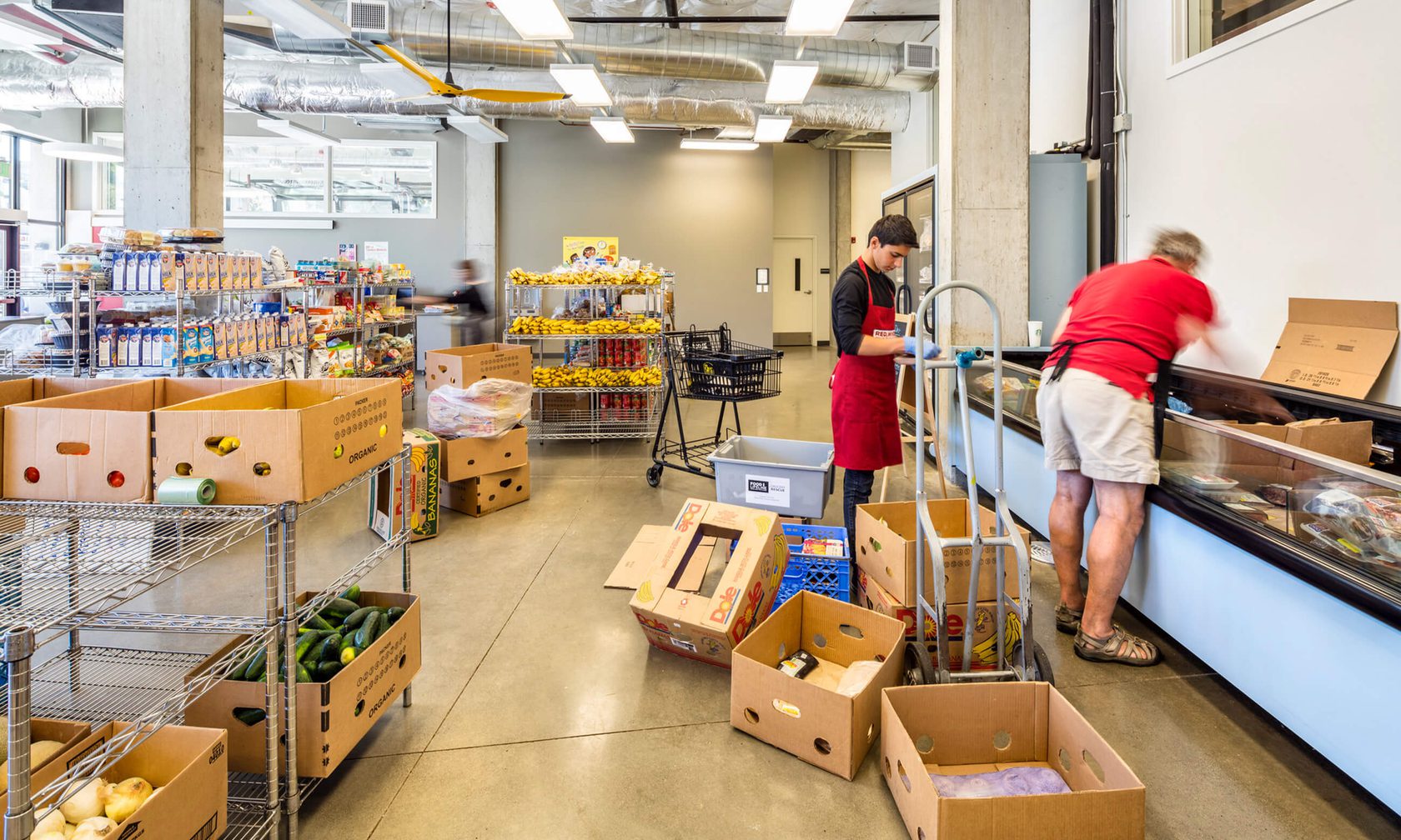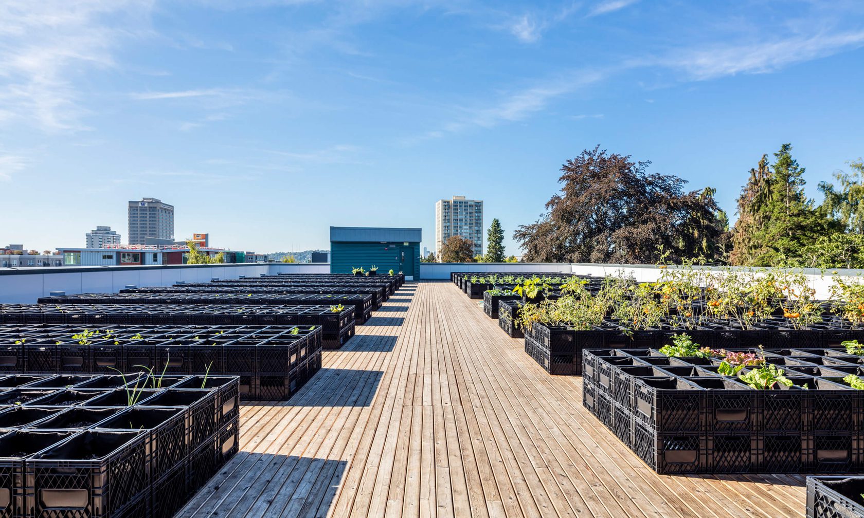 Marion West is a build-out of a four-story affordable housing mixed-use complex with 49 apartments. The building is wood-framed construction on top of a concrete elevated floor deck. The University Food Bank has a food bank center at the street level with a large roof deck to grow vegetables that are served at the food bank. The apartments are available for unhoused teens and adults via Youthcare and LIHI.