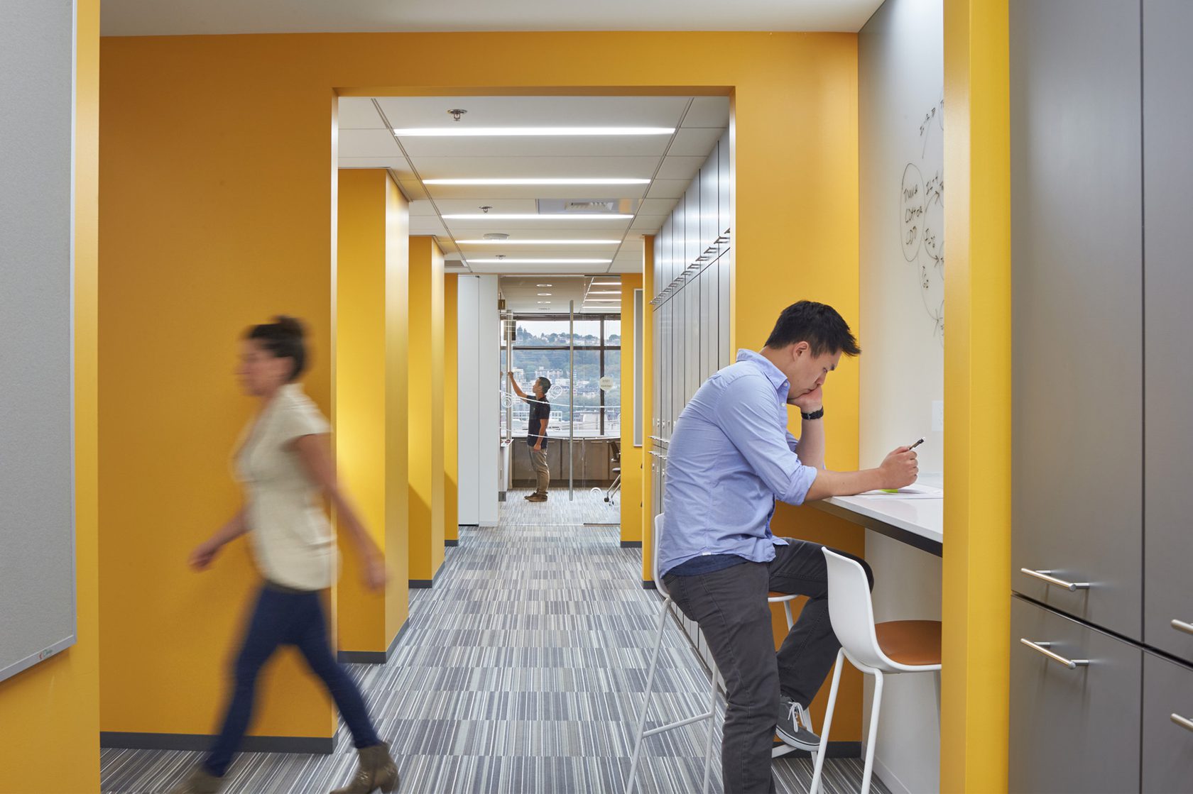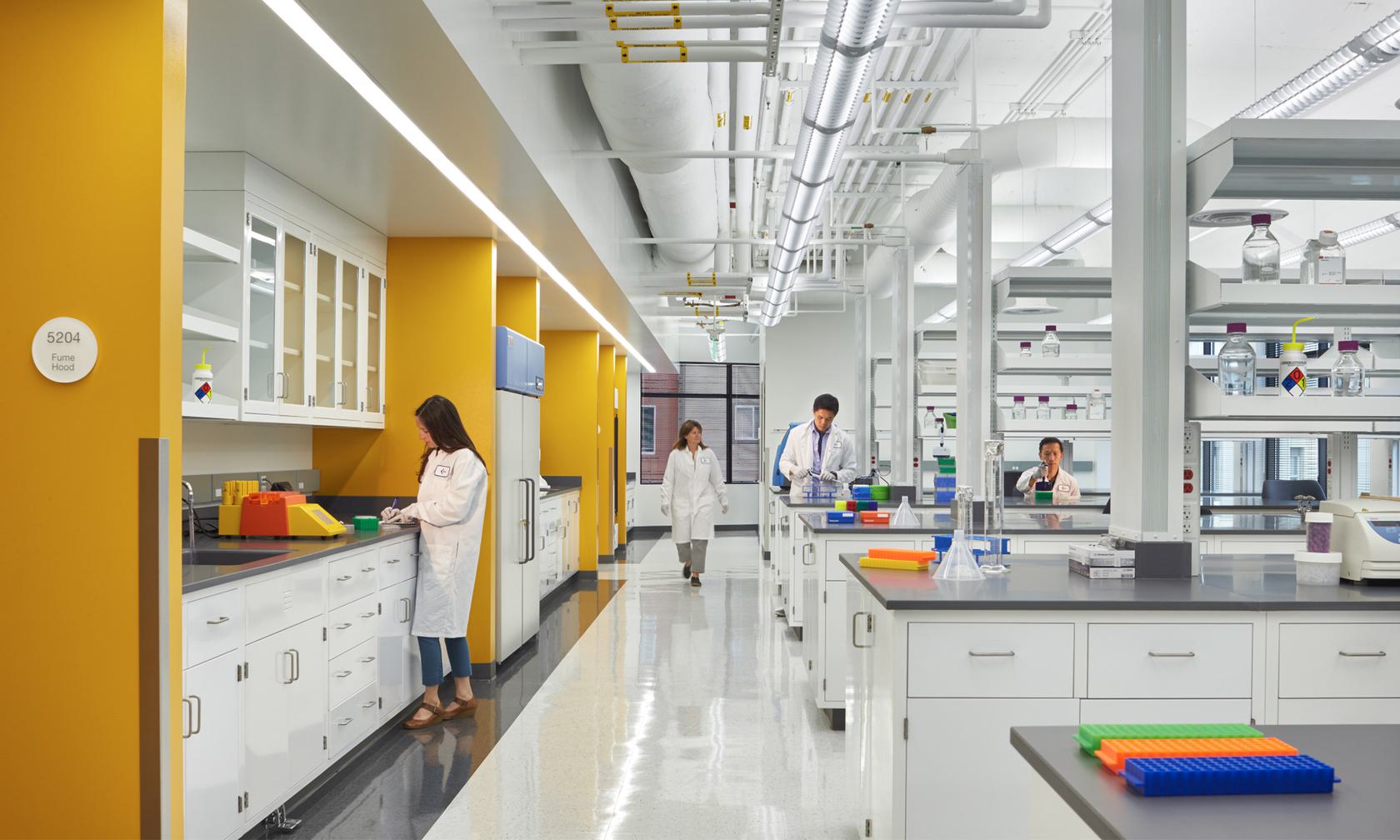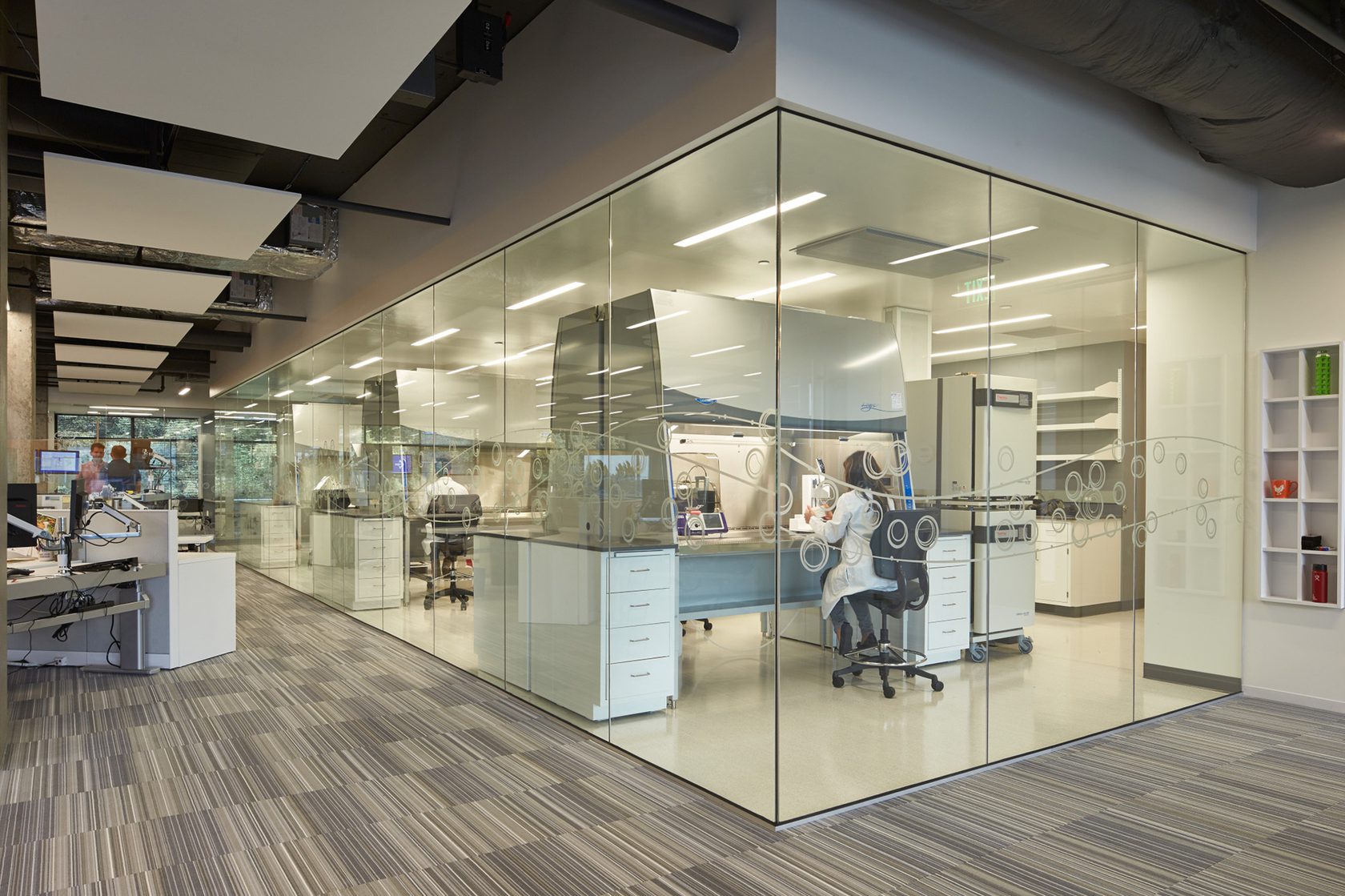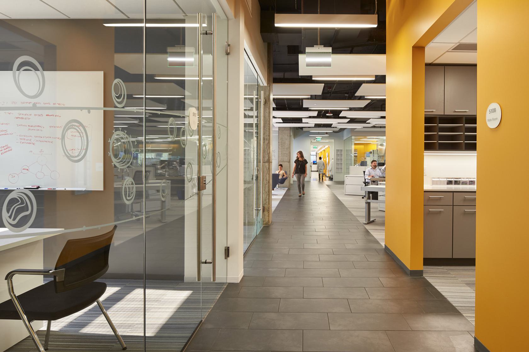 A buildout of a biology lab and office tenant improvement in an existing building included 10,000sf of office space and 10,000sf of BSL-1 and BSL-2 laboratory space. The office space is an open floor concept with offices, and conference and break rooms at the perimeter with pinwheel desk stations at the core of the space.