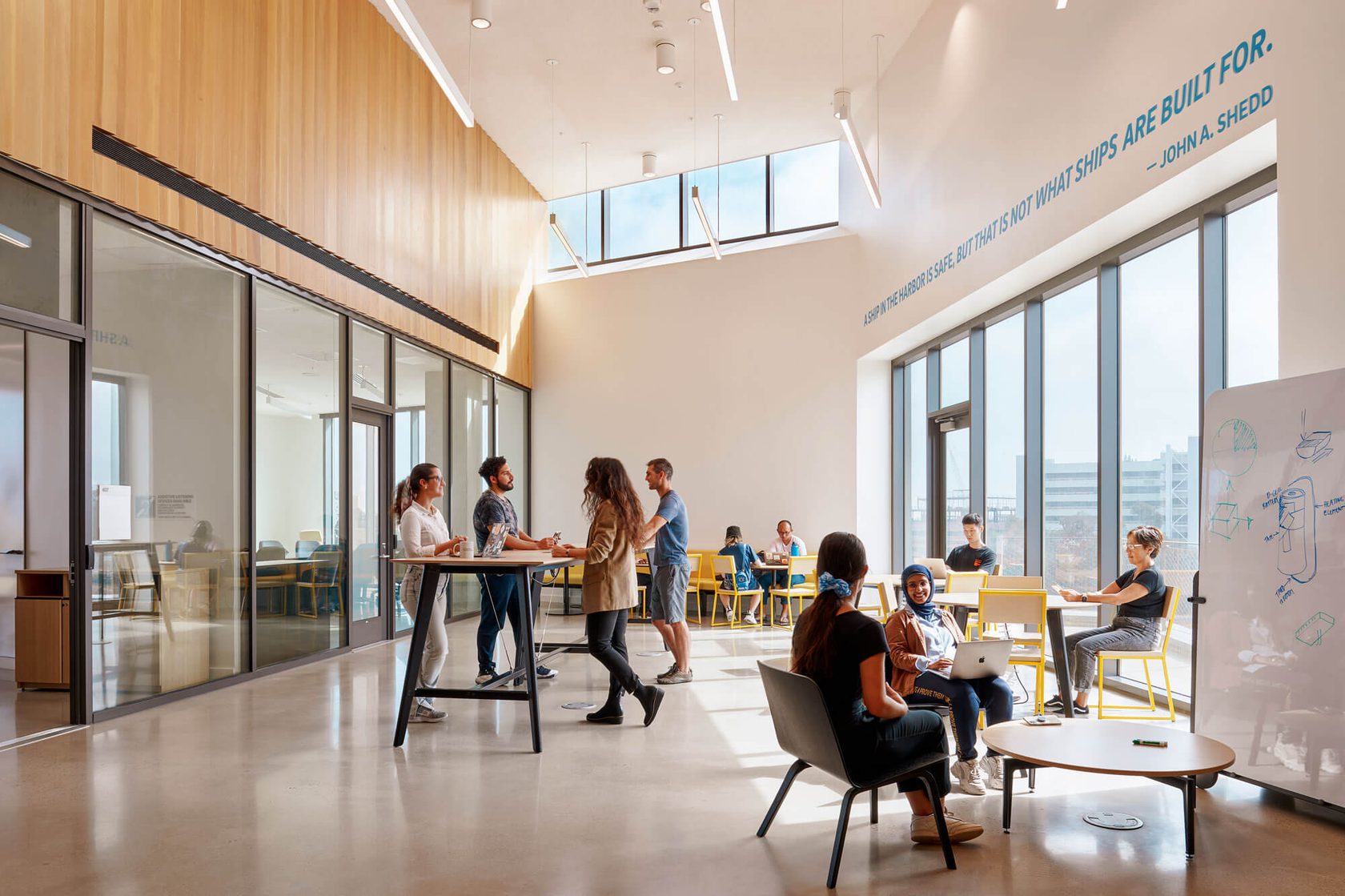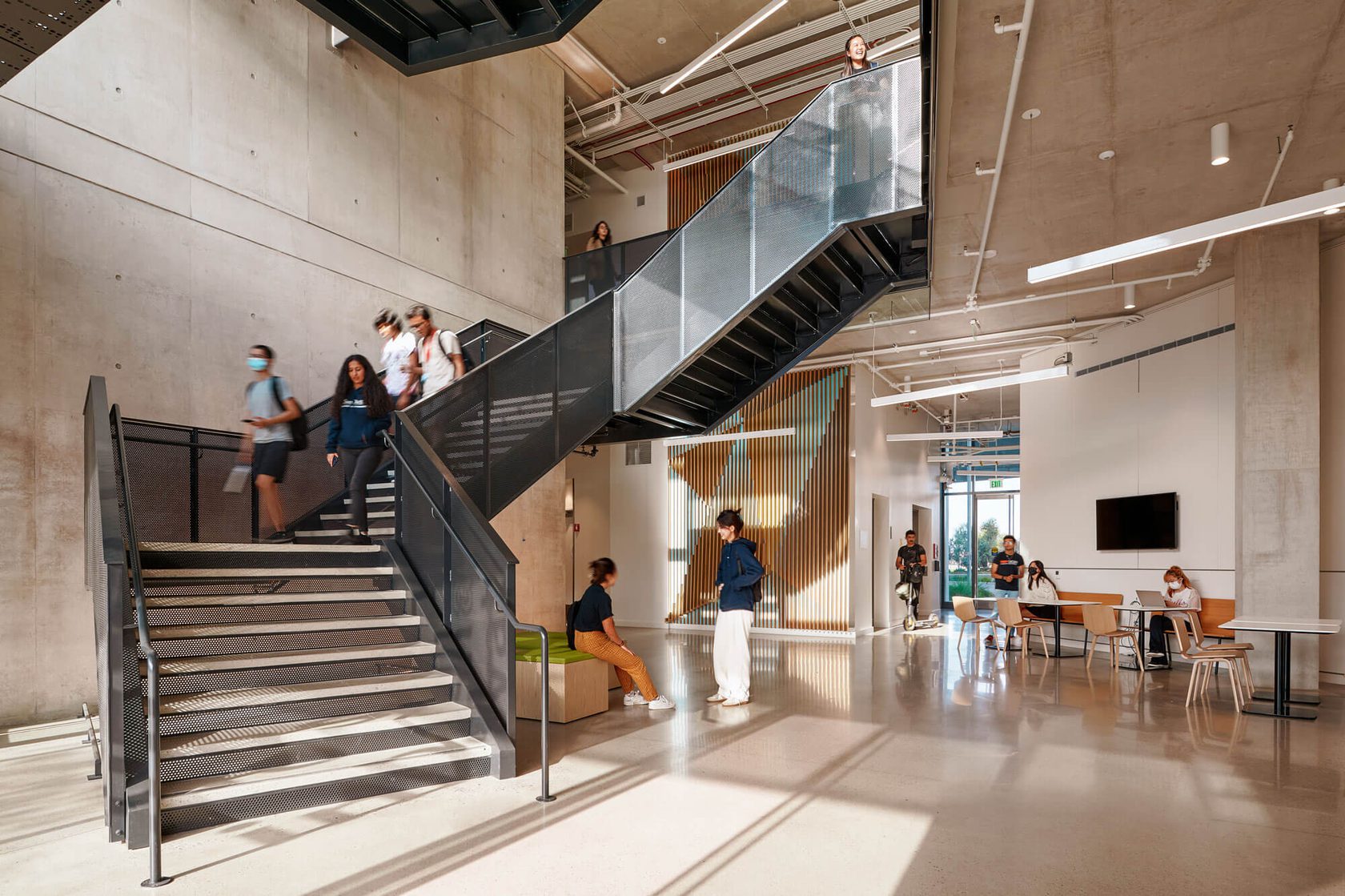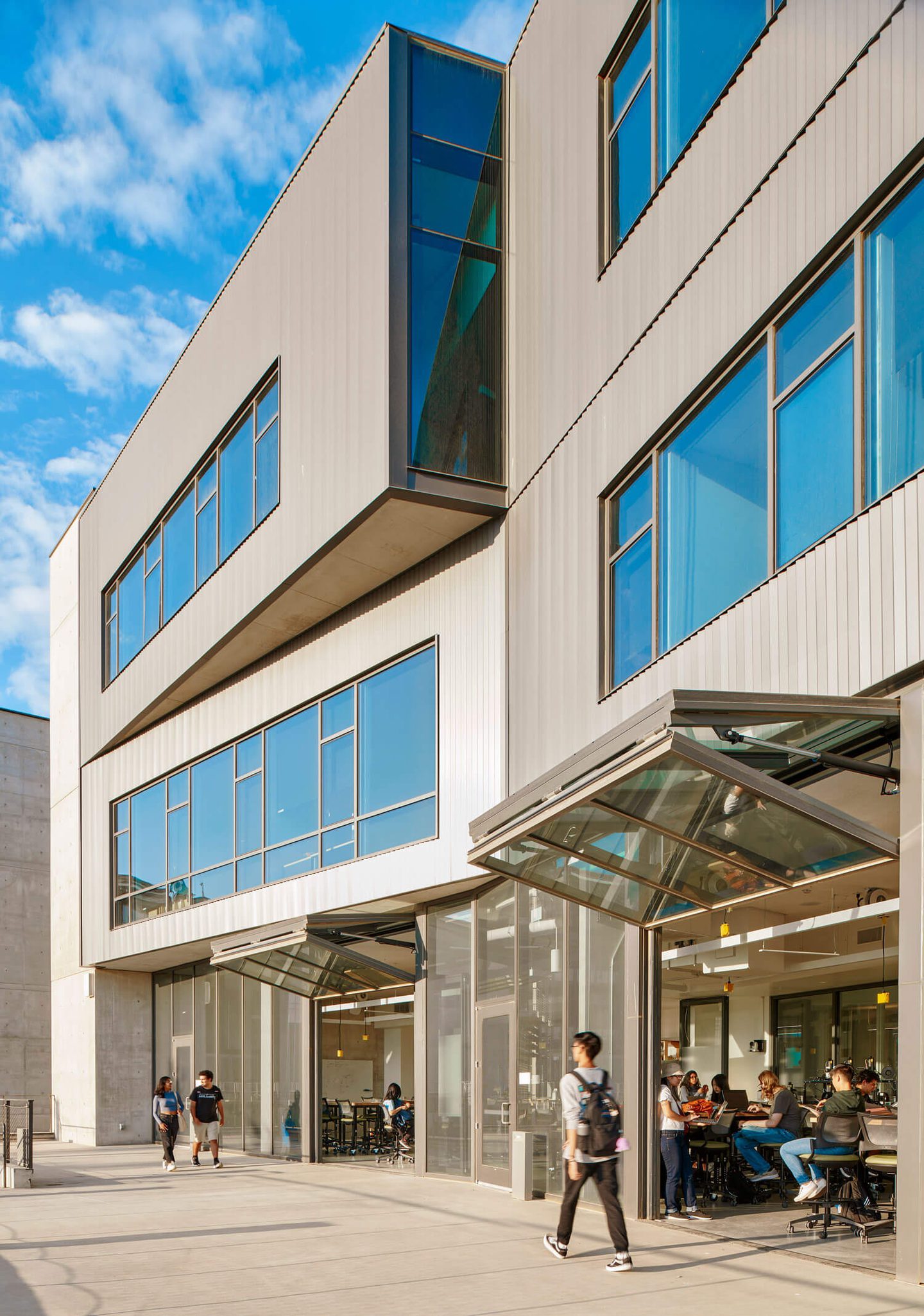 The Design and Innovation Building is a 74,000sf collaborative facility that collocates entrepreneurial activities previously dispersed across campus. The four-story building offers general-assignment classrooms, meeting rooms, a large event venue, a restaurant, and offices for faculty and graduate students.