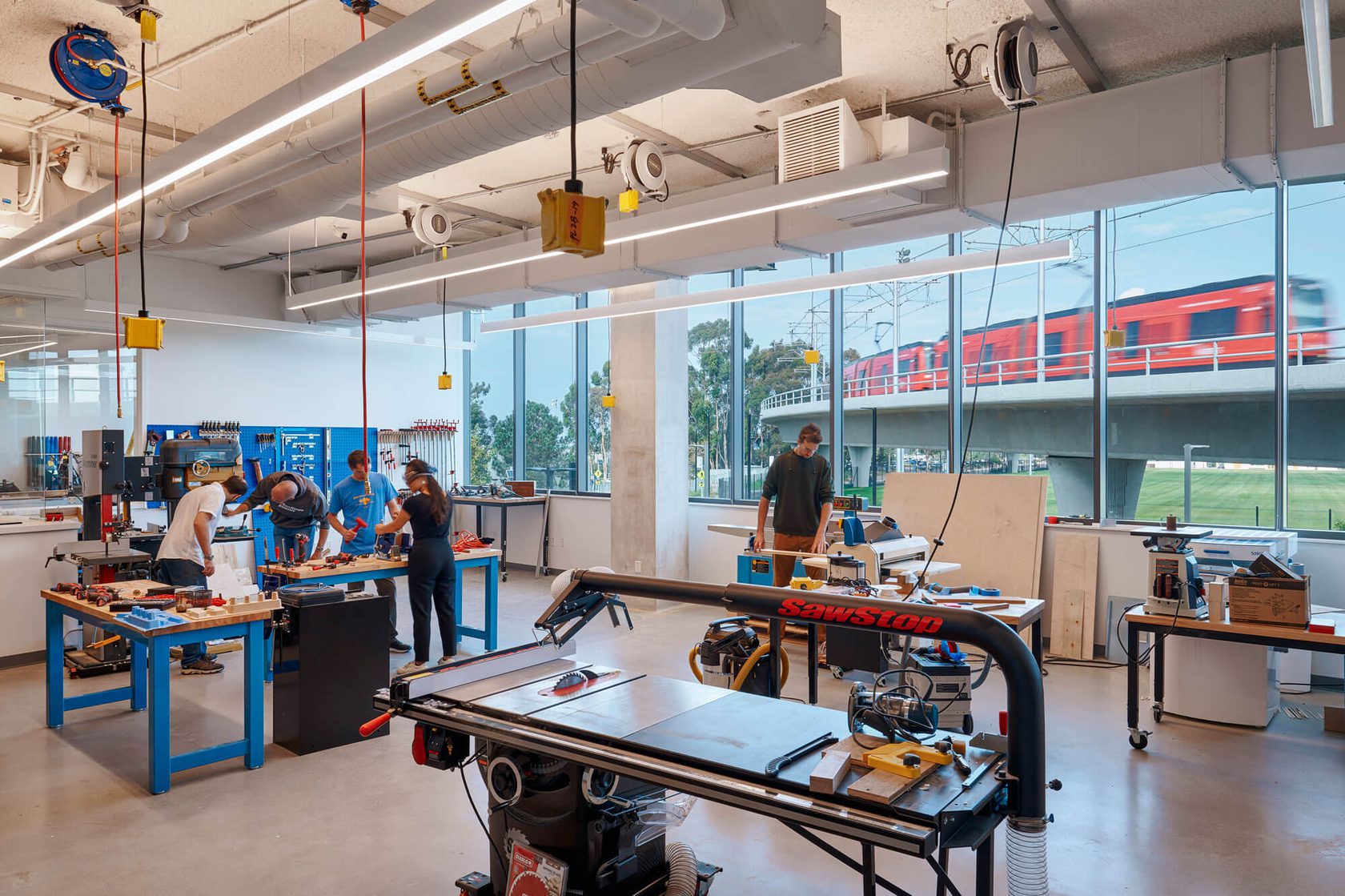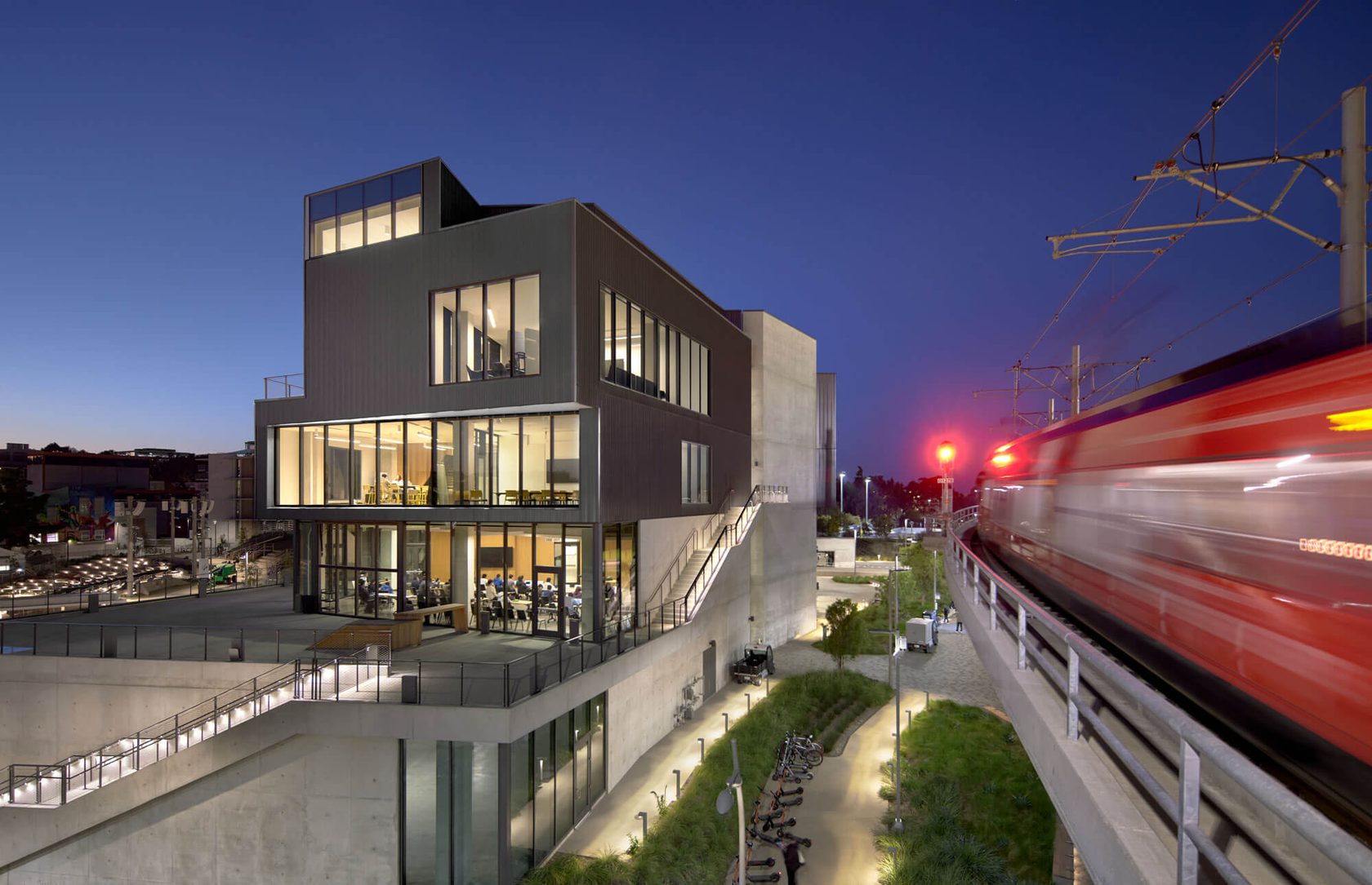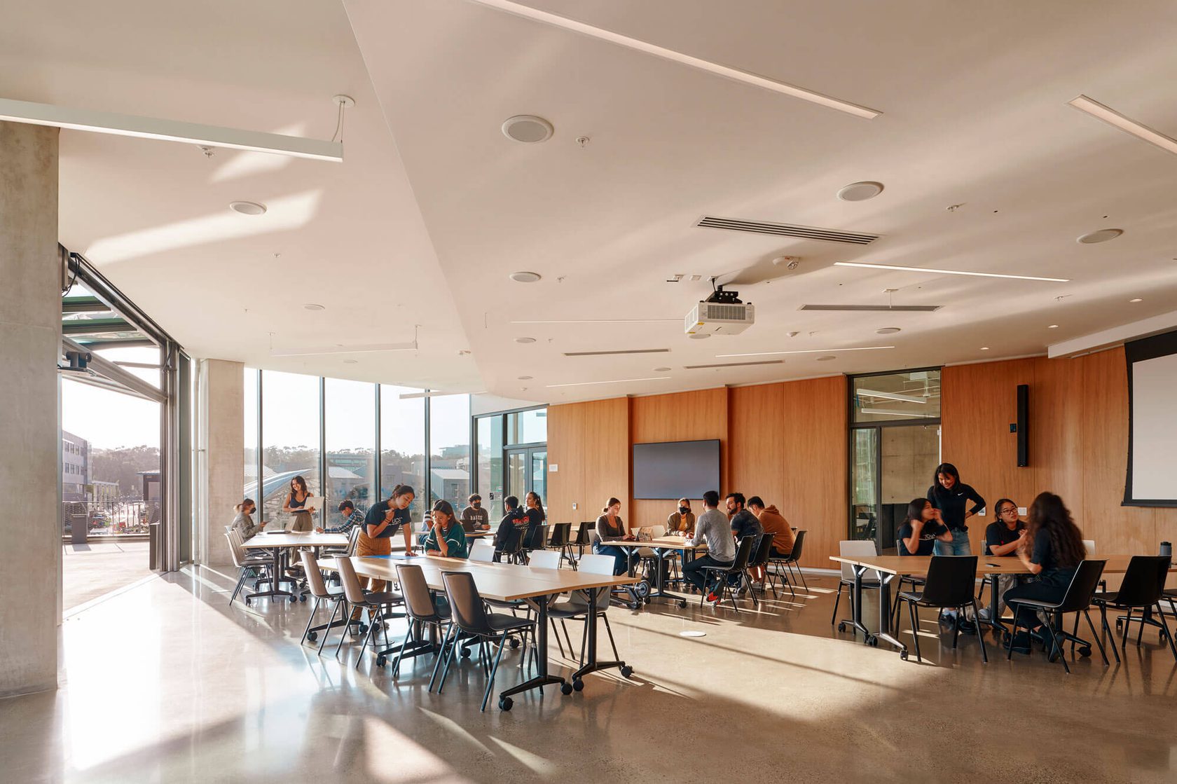 The Design and Innovation Building is a 74,000sf collaborative facility that collocates entrepreneurial activities previously dispersed across campus. The four-story building offers general-assignment classrooms, meeting rooms, a large event venue, a restaurant, and offices for faculty and graduate students.