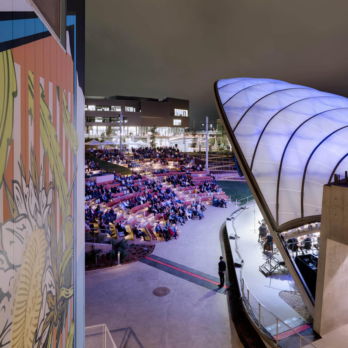 Located in the heart of the Pepper Canyon neighborhood, the Epstein Family Amphitheater is a multi-functional performance venue for students, faculty/staff, and the wider professional and public community use. The amphitheater is positioned to make use of the natural landscape for seating and utilizes a custom-designed acoustic system to amplify sound through the outdoor venue. The project also improved surrounding landscaping and facades for three existing visual arts buildings, installed Stuart Collection artwork, and constructed the Rupertus Walk which connects the greater UC San Diego campus to the Blue Line Trolley extension.