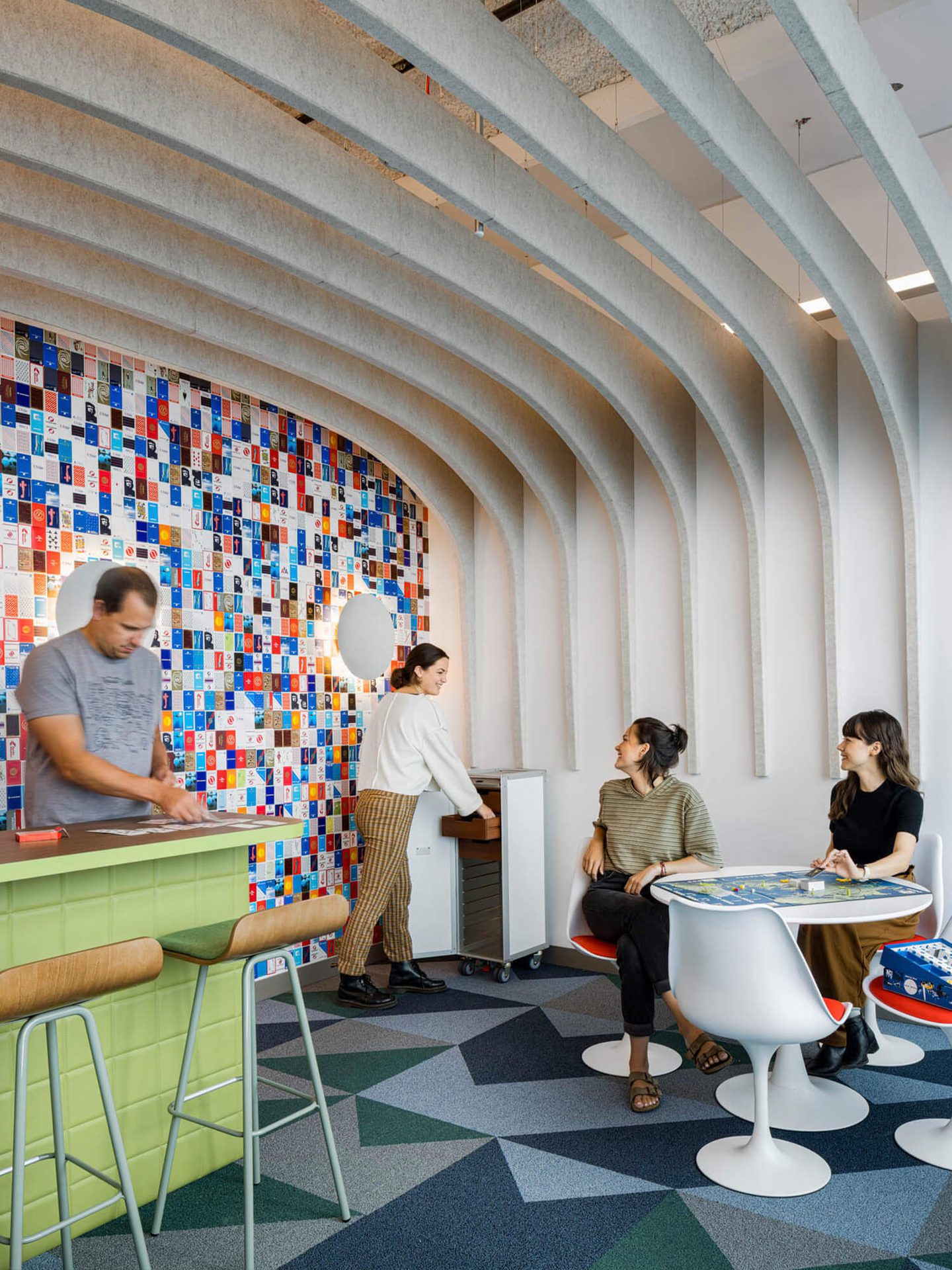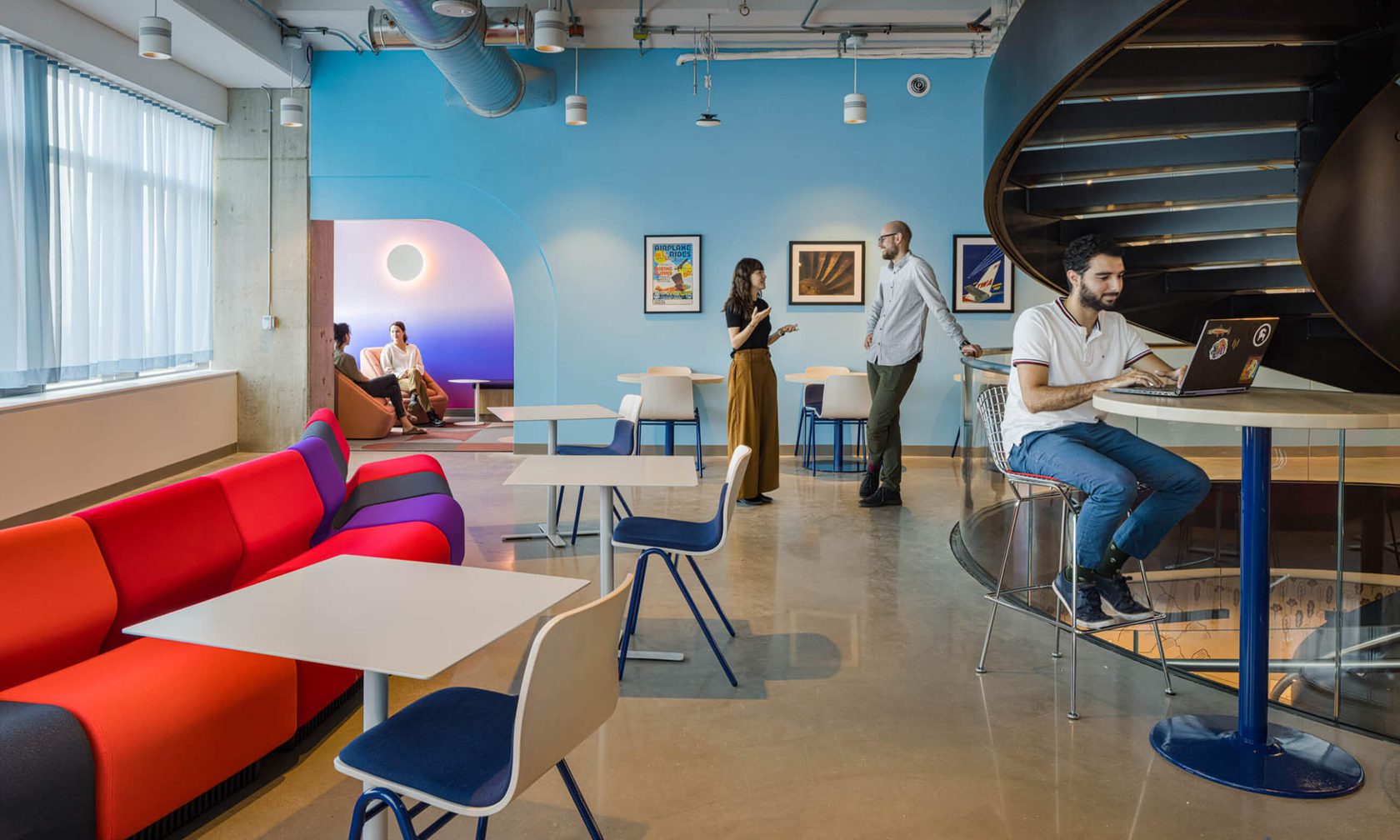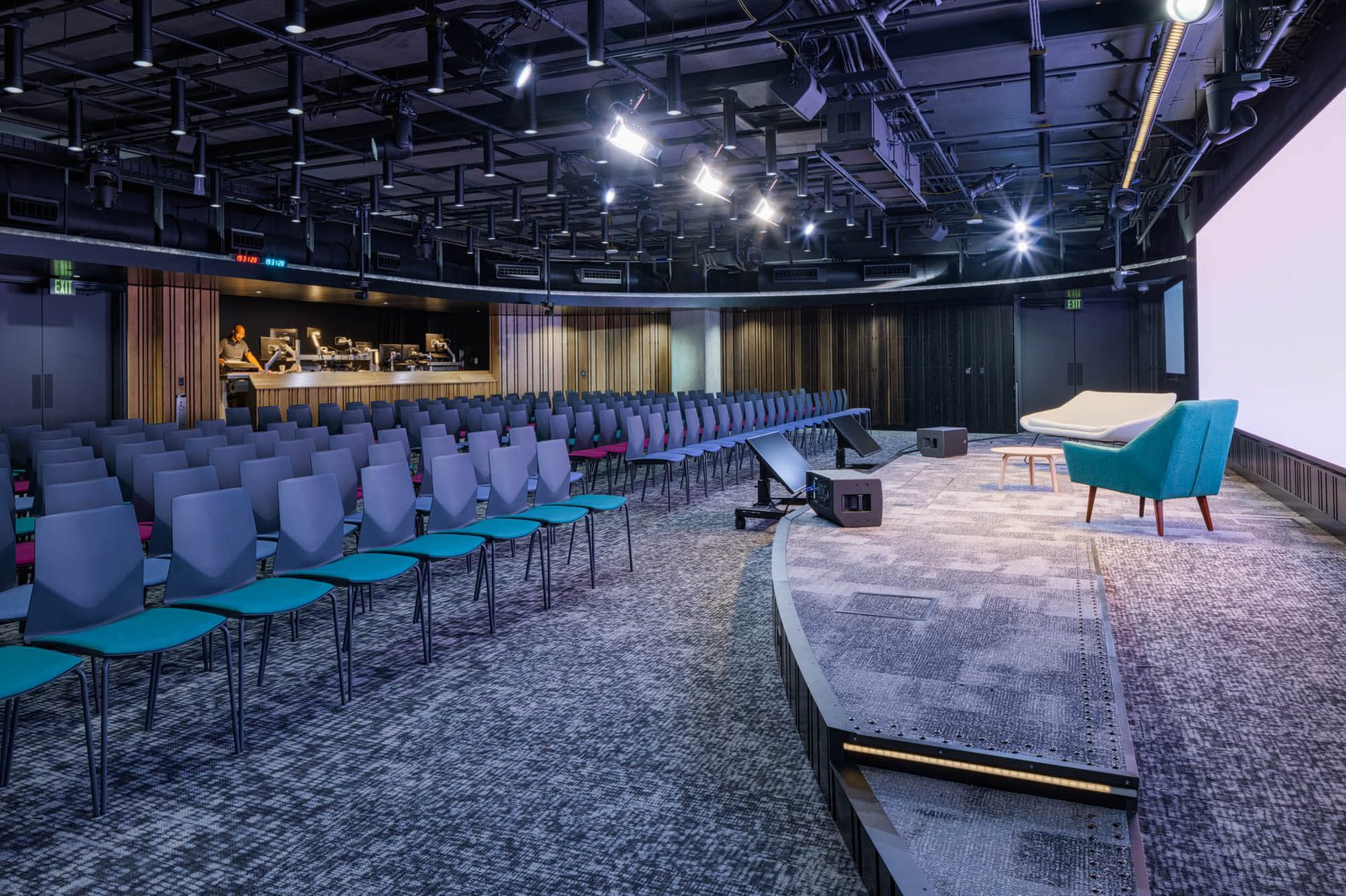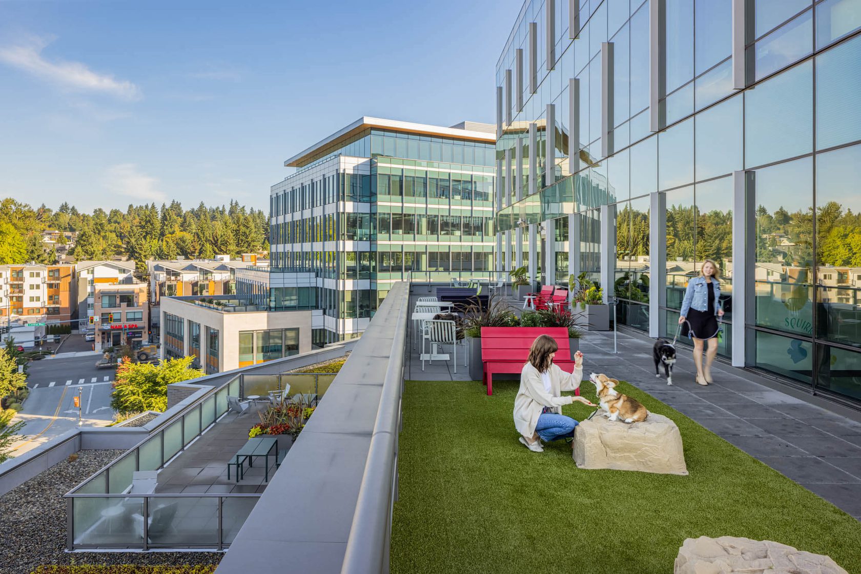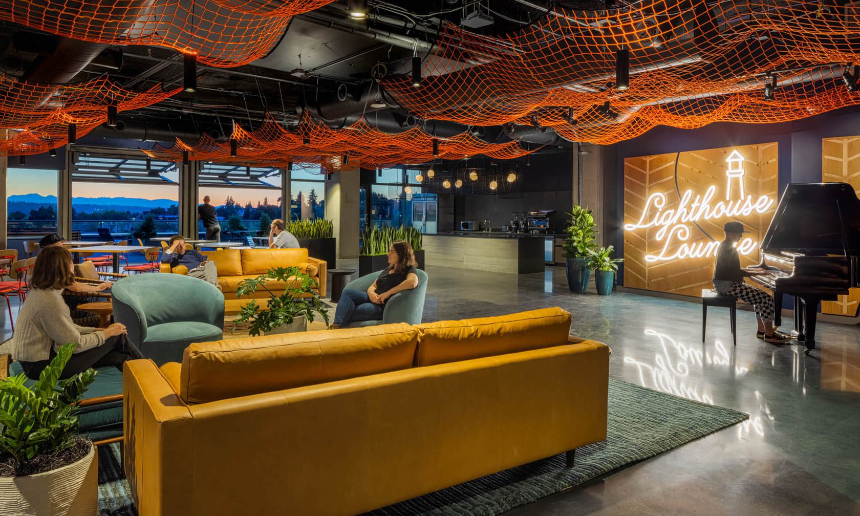 Amenities include workspaces, research areas, a five-story spiral staircase, seven micro kitchens, two full-service front-of-house and back-of-house cafes, a 250-seat event production space, a music room, an arcade, bike storage, outdoor patios, a wellness center, and a fitness center with locker rooms.
