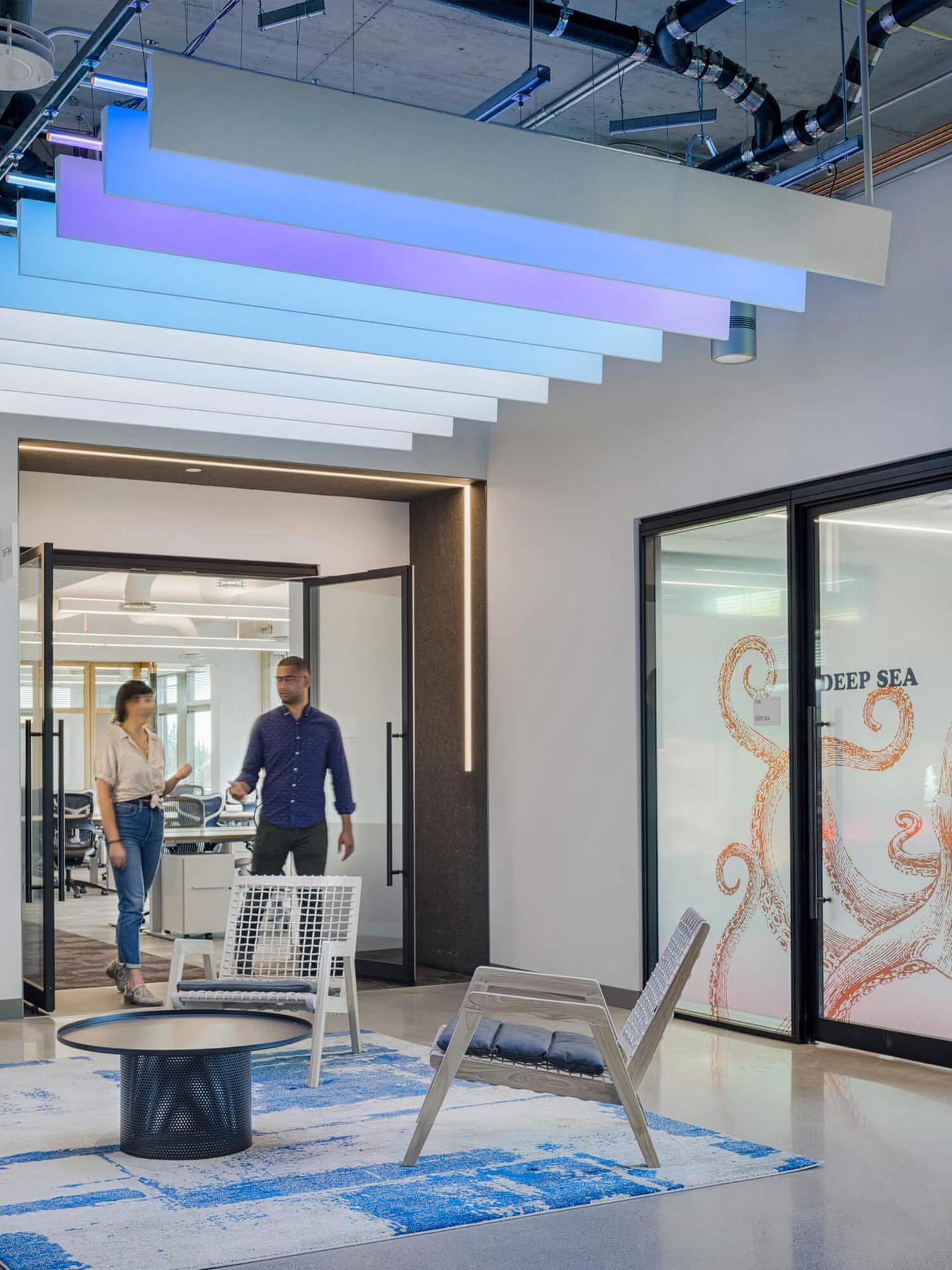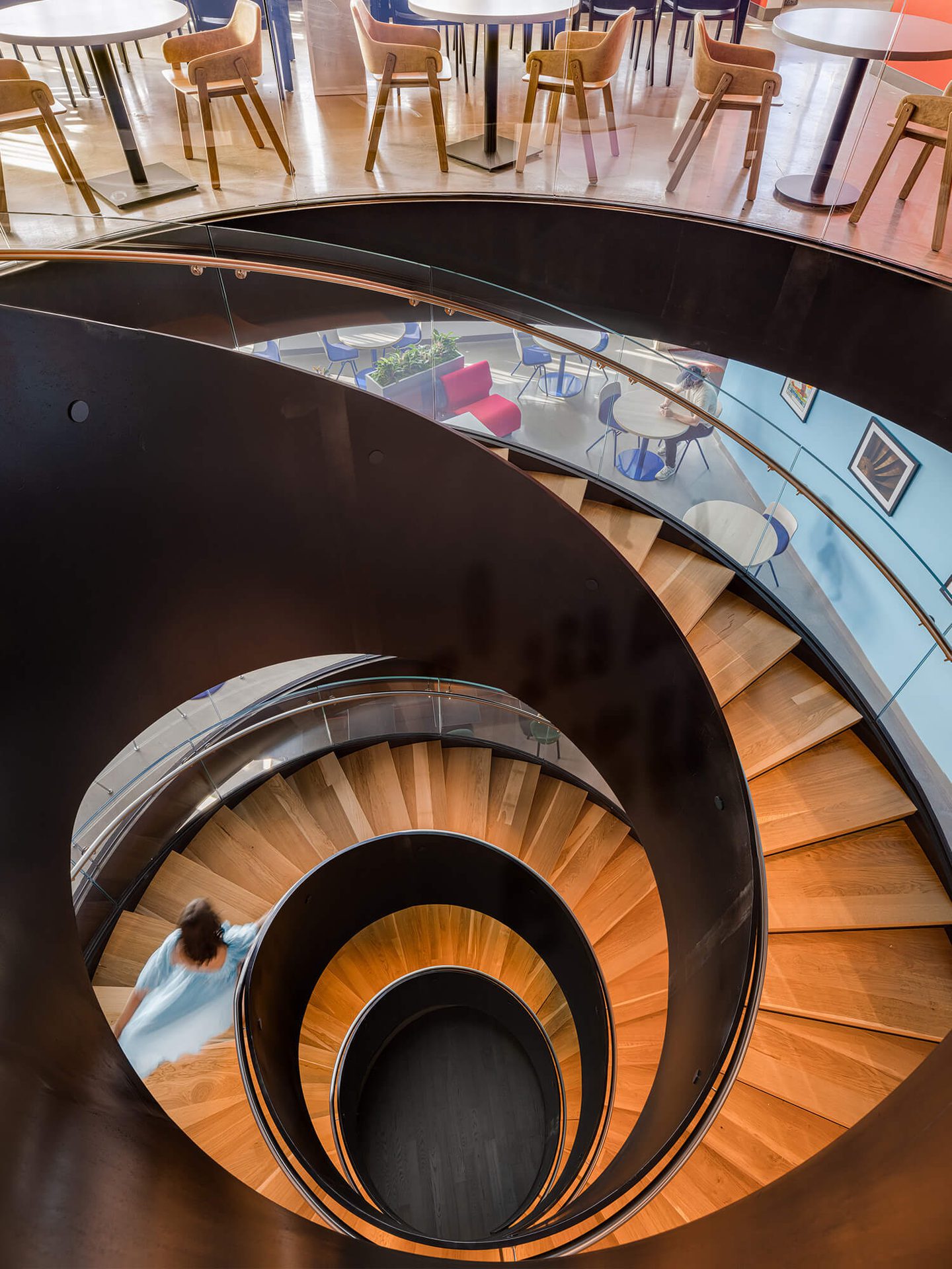 Tenant improvement of two mixed-use commercial office buildings. These amenity-heavy TIs included significant modifications to the shell and core to accommodate three added stairs, particularly the curved central building feature stair which required de-tensioning of PT decks at all five stories.