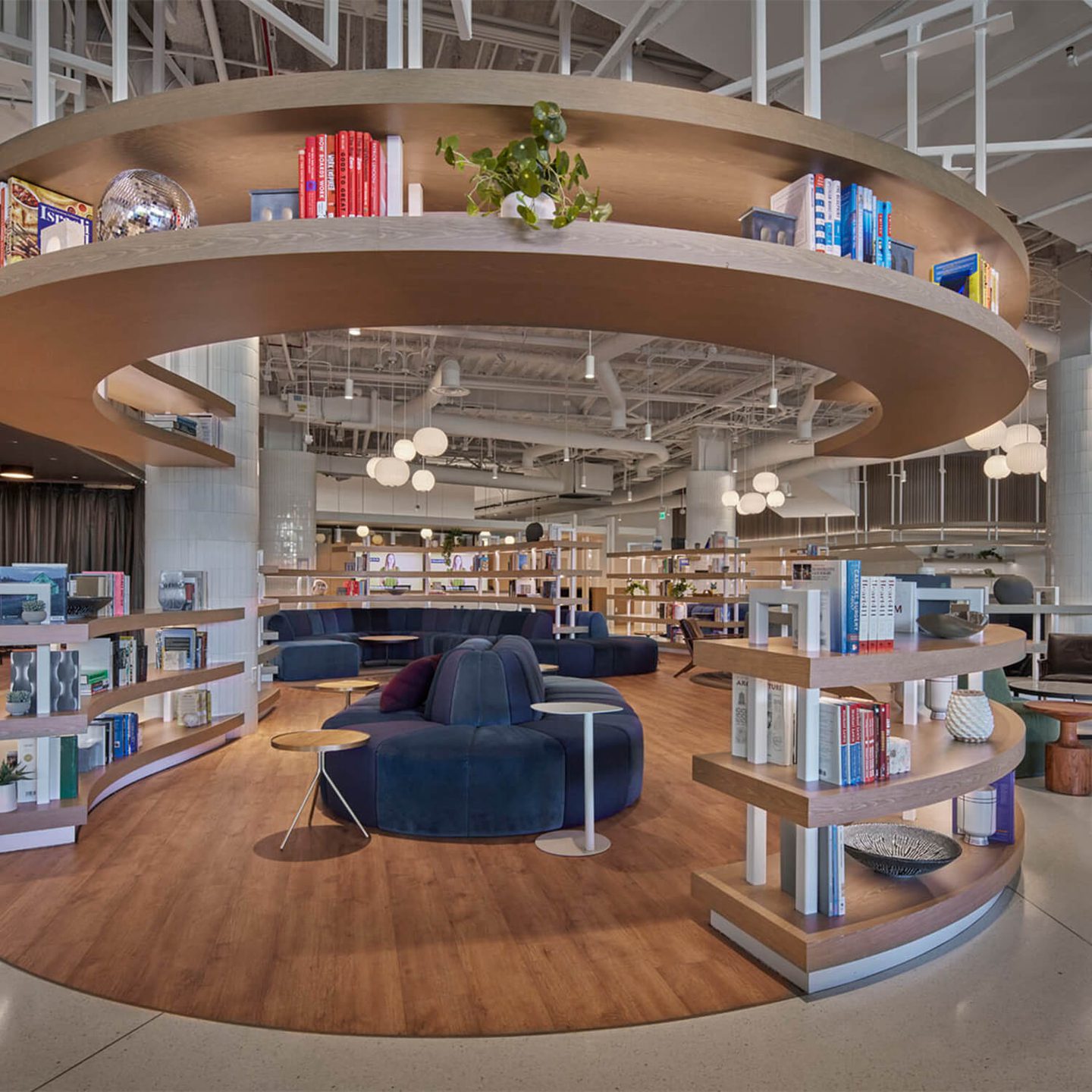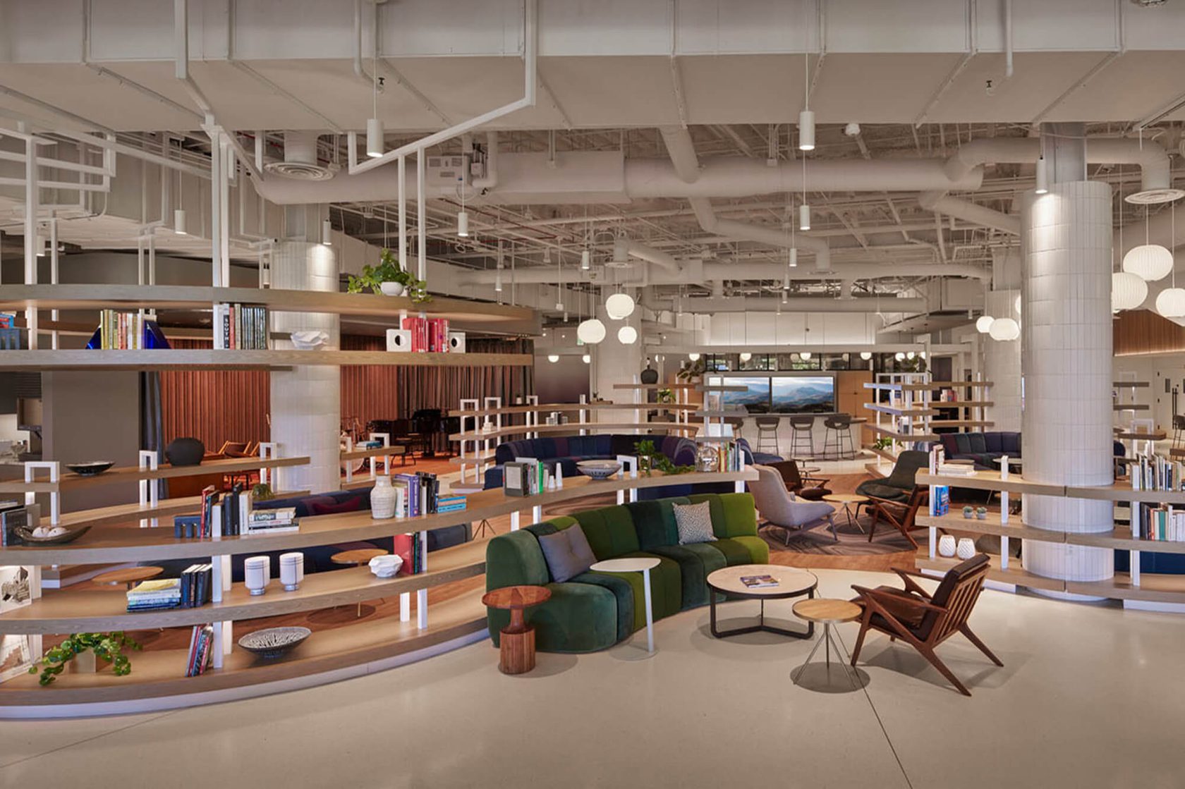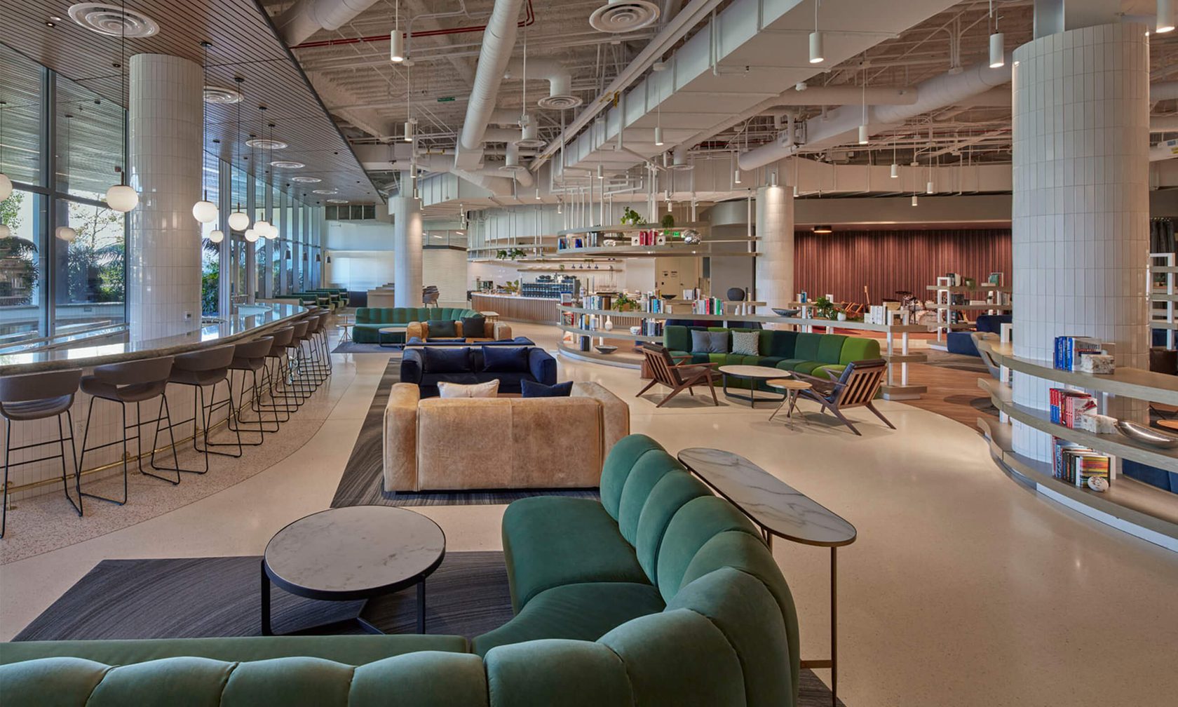 A vibrant café reimagined within a fully occupied office building. This 14,100-square-foot renovation and expansion transformed an existing café and outdoor patio into a dynamic space featuring a music room, technology bar, indoor/outdoor bar, library, private dining areas, and a modern kitchen. Careful planning and coordination minimized disruption to building occupants and visitors while delivering a functional, collaborative environment that enhances the overall employee experience.