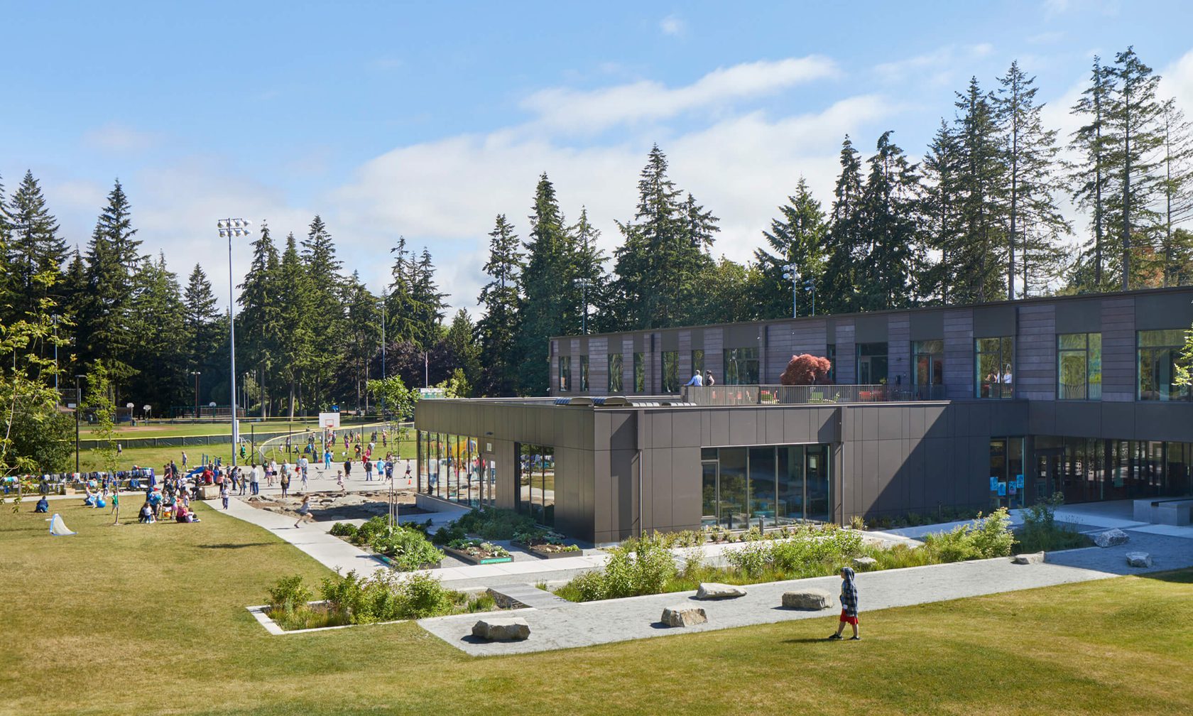 This project involved the ground-up construction of a school for the Edmonds School District. Situated directly adjacent to a park and playground in a residential neighborhood, the scope of the project encompassed the demolition of the existing facility and the subsequent construction of a new facility. This new facility included the development of parking and bus circulation areas, the implementation of new stormwater management facilities, and the establishment of new sports fields.