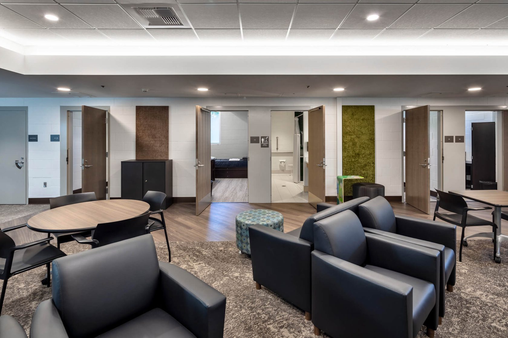 The two-story behavioral health treatment facility included a 16-bed treatment center with clinical support spaces, facility support services, and administrative functions. The project also included interior renovations to part of the building and a two-story addition. All work was completed while the center remained fully operational, necessitating a robust site logistics plan, regular communication with facility staff, a detailed phasing approach, and heavy focus on site isolation and safety.