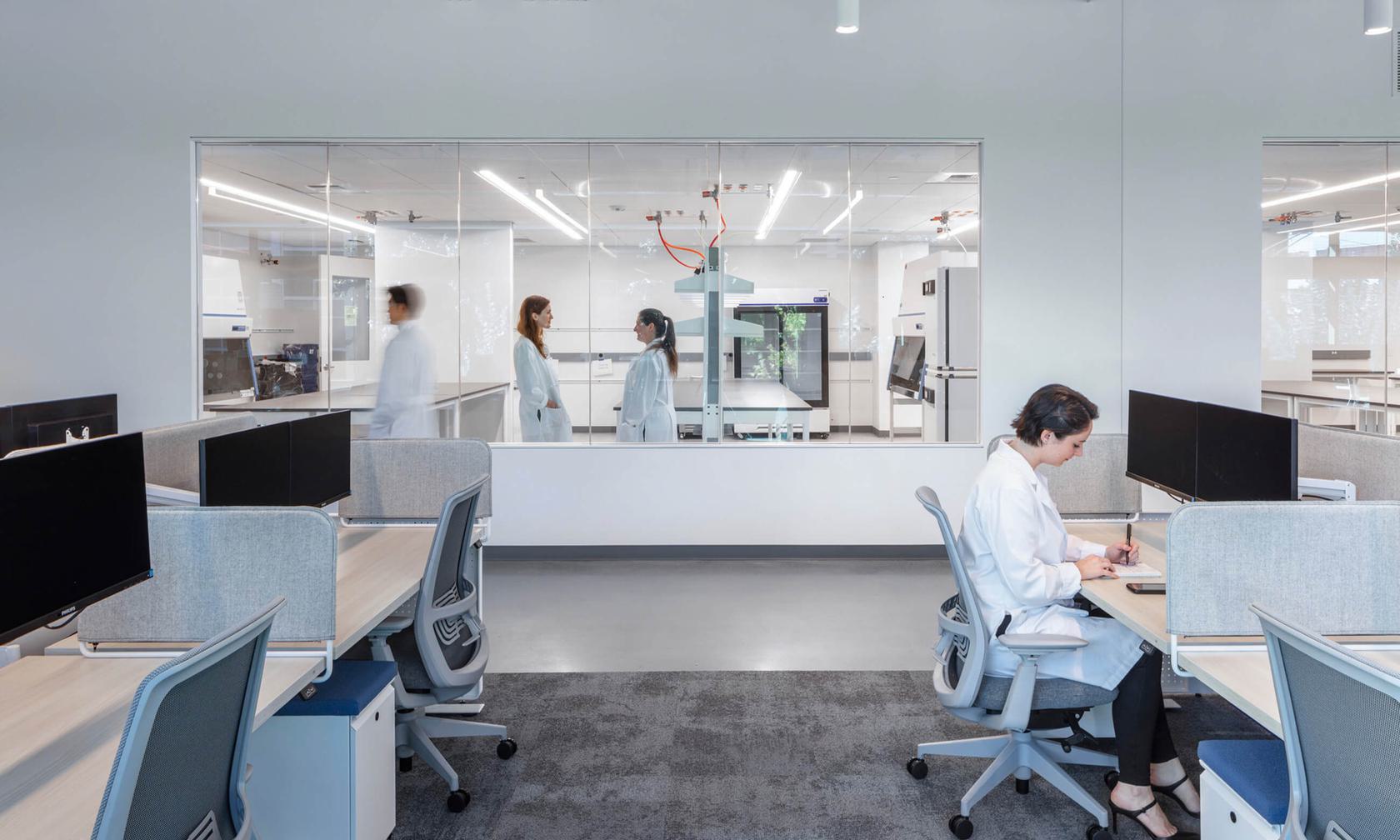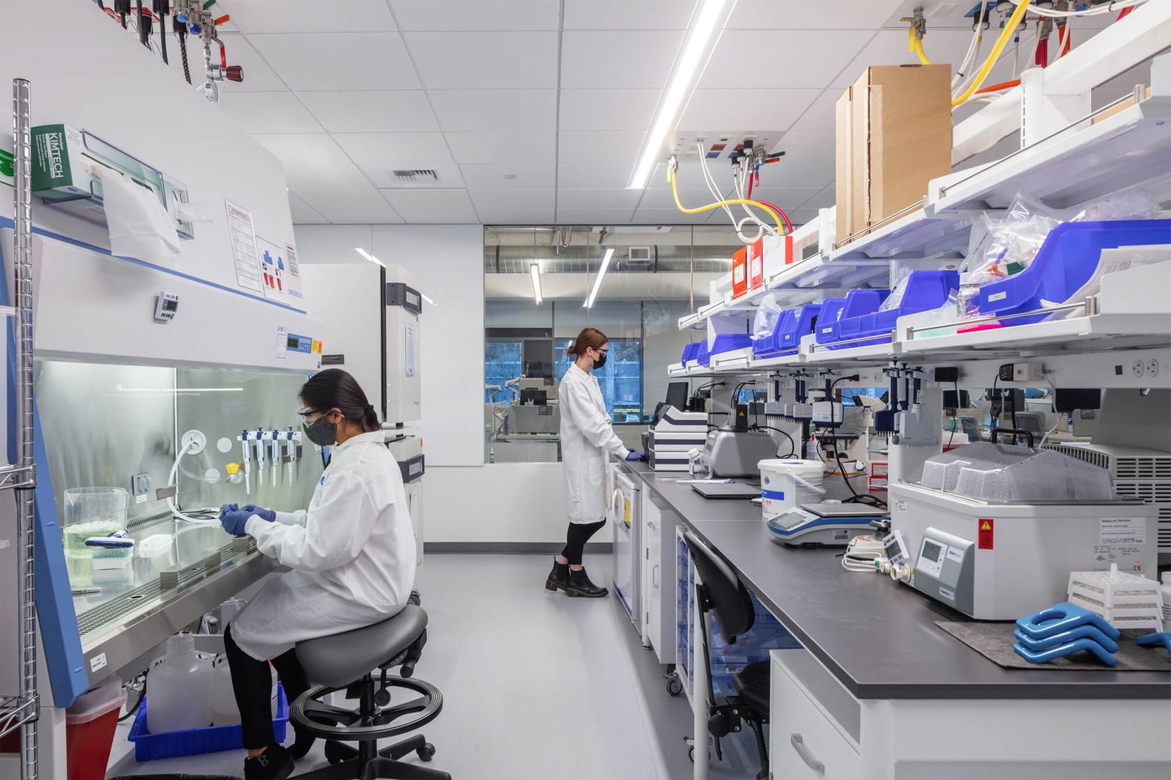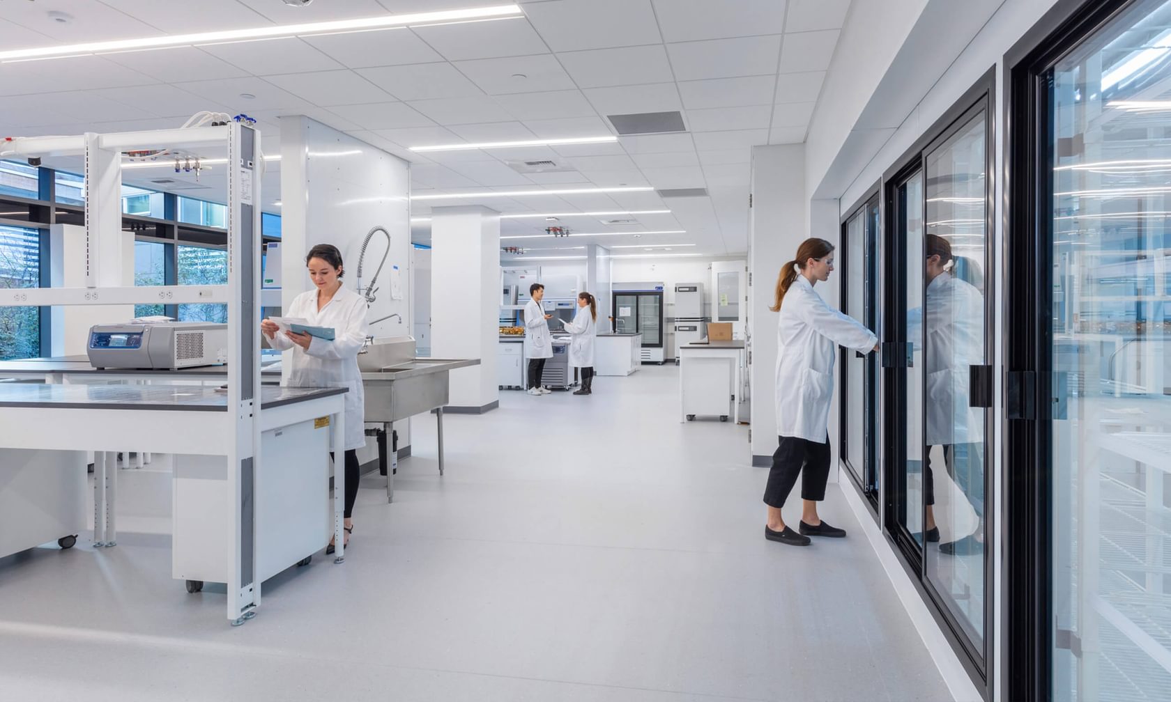 This MEP design-build build-out of R&D labs included a cold room, gas manifolds, and a server room. The scope also included office space, collaboration spaces, and a kitchenette.