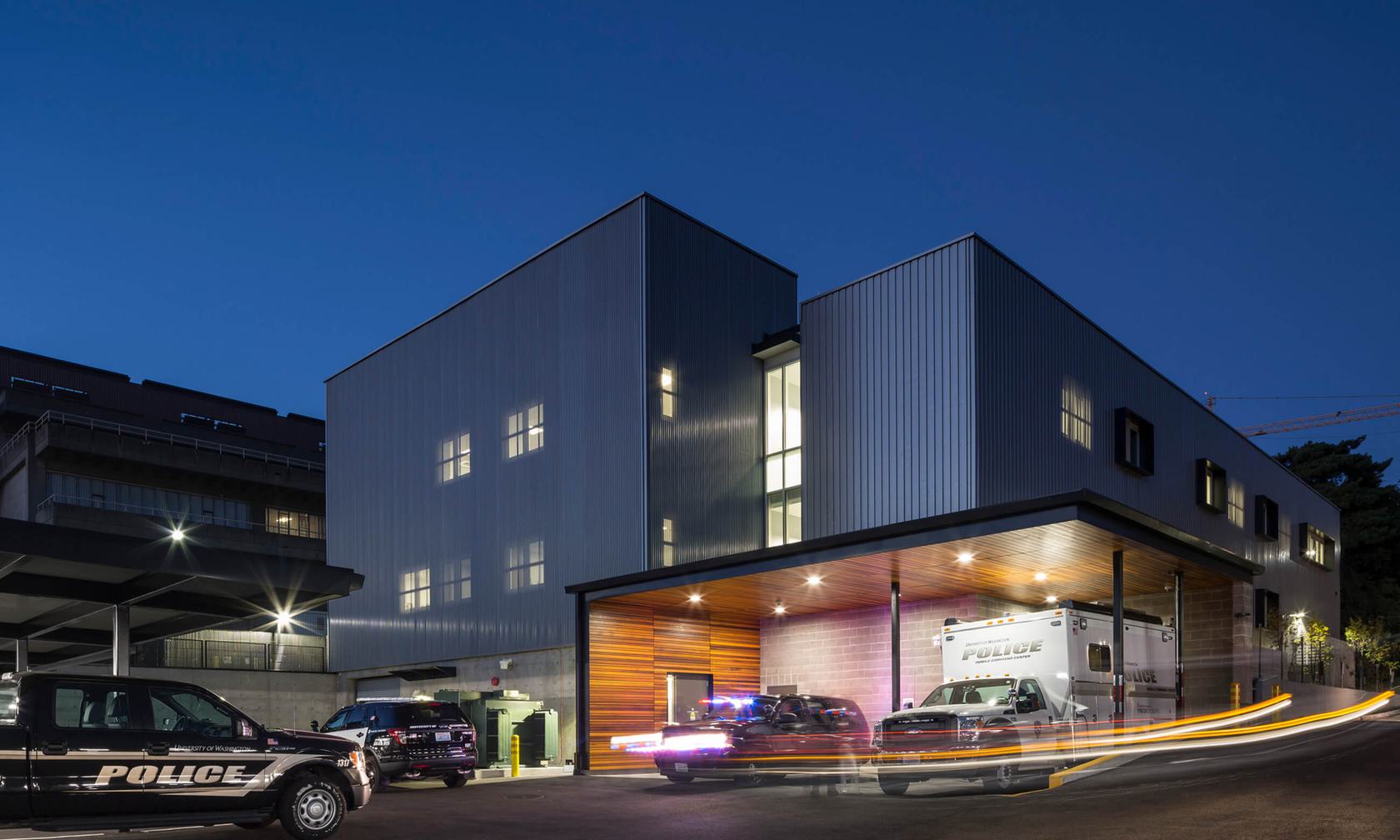 A two-story building containing police offices, dispatch/communications center, records storage, suspect processing, interview, and report taking rooms. It also includes non-secure juvenile waiting rooms, evidence storage, locker/fitness rooms, conference rooms, community multi-purpose/training rooms and fleet parking.